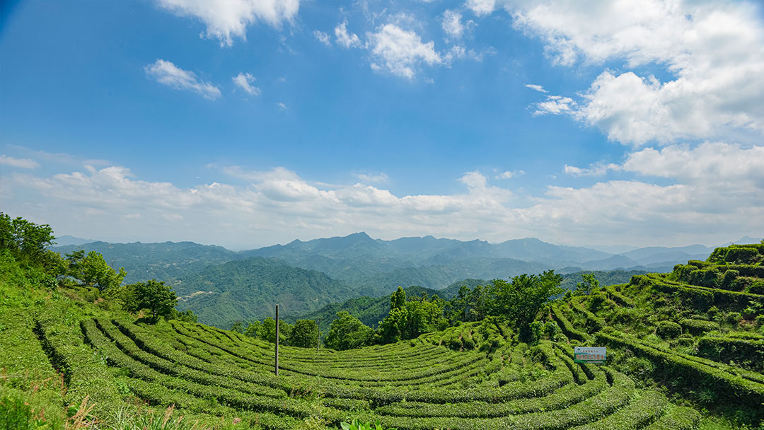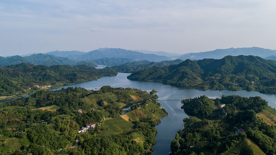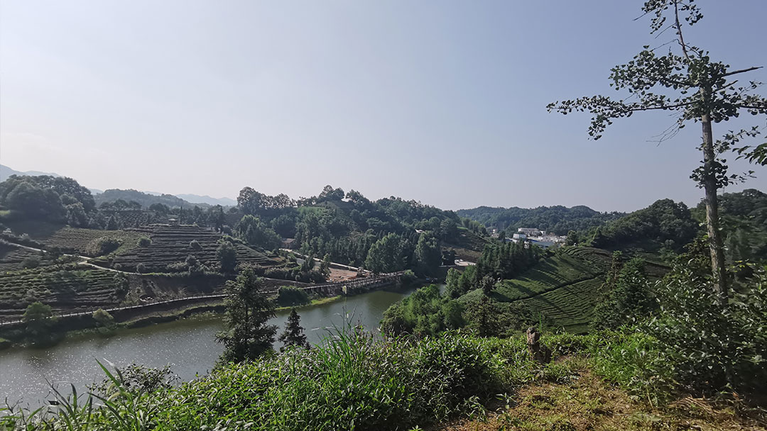 【概要描述】六安瓜片原产地的一角。园内自然风光旖旎,水天一色,纵使已入冬季,茶谷中依旧秋色未尽,茶园葱翠,远山如黛,比春日里更多了一份静谧的美。
